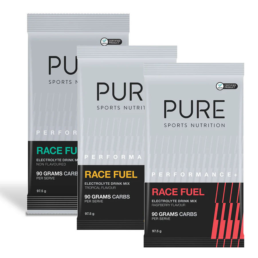 PURE Performance + Race Fuel is a high carb, high sodium drink to incorporate into your training and race strategy. It can be used a sole source of fuel and is unflavoured to minimise flavour fatigue.