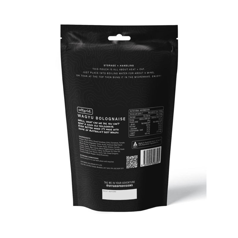 Wagyu Beef (44%), Diced Tomatoes (21%) [Tomatoes, Tomato Juice, Acidity Regulator (Citric Acid)], Premium Beef Stock (Beef Bones, Tomatoes, Tomato Paste, Onions, Carrots, Celery, Garlic, Bay Leaves, Black Peppercorns), Tomato Paste (6.6%), Onions, Carrots, Celery, Sunflower Oil, Olive Oil, Gluten-Free Corn Starch, Garlic, Salt, Dried Oregano, Cracked Black Pepper, Dried Rosemary.