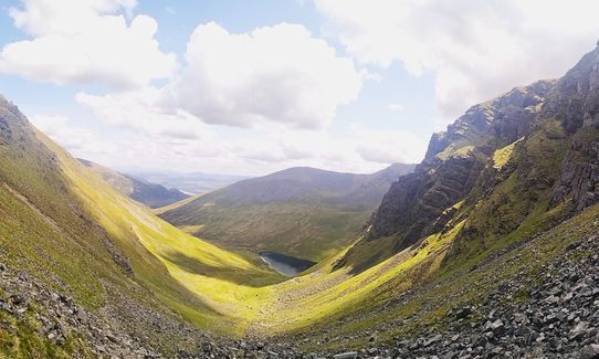 From Creag Meagaidh, retrace your steps back to the ‘window’, then follow the bouldery path that zig zags down the hill to Lochan a’Choire and continue on the path back to the carpark.